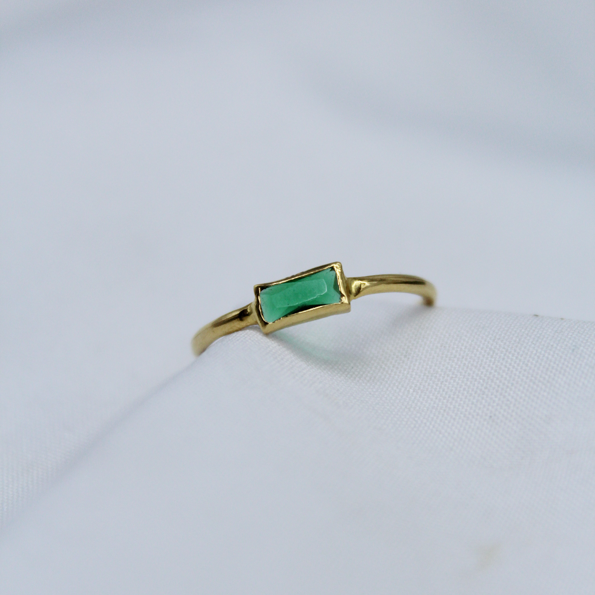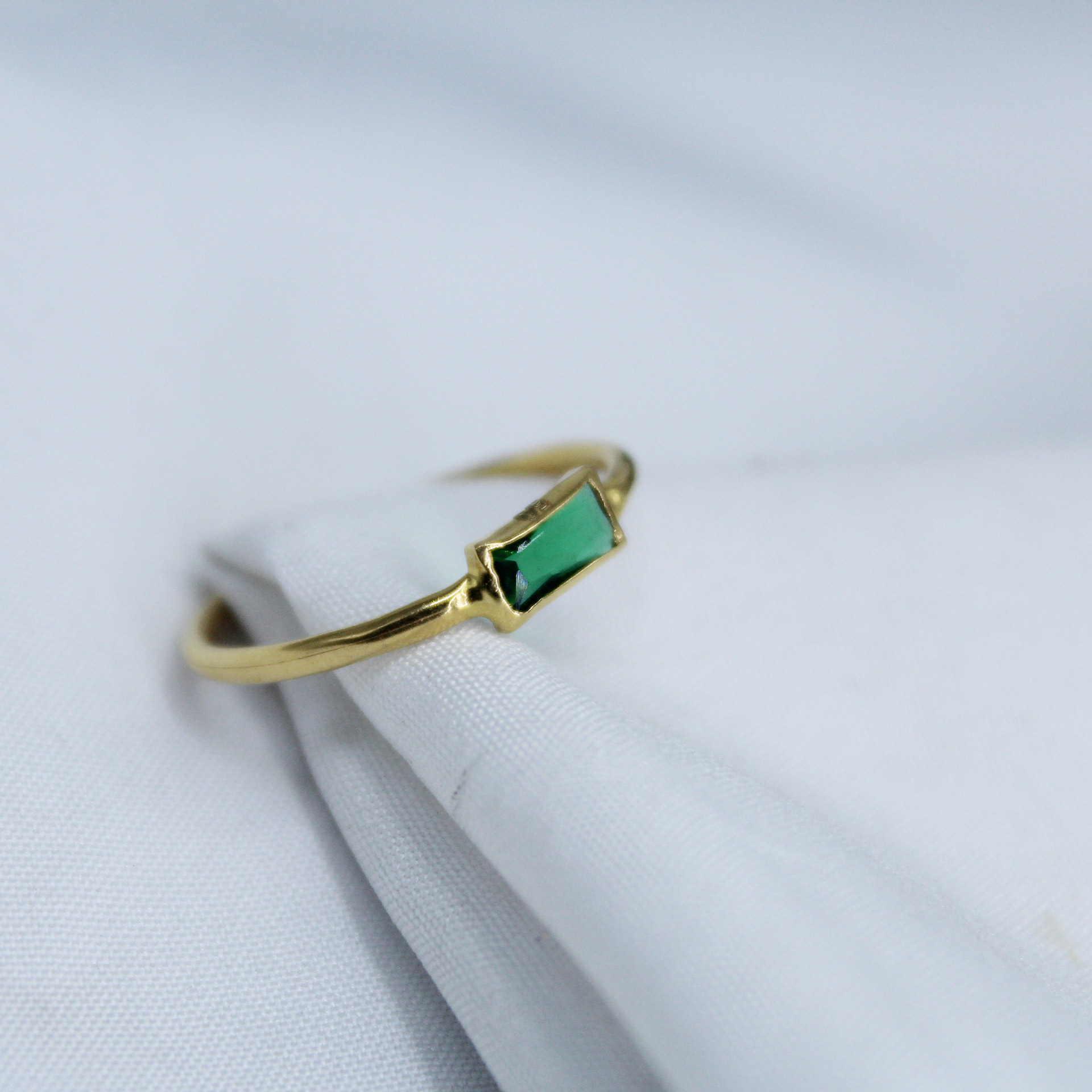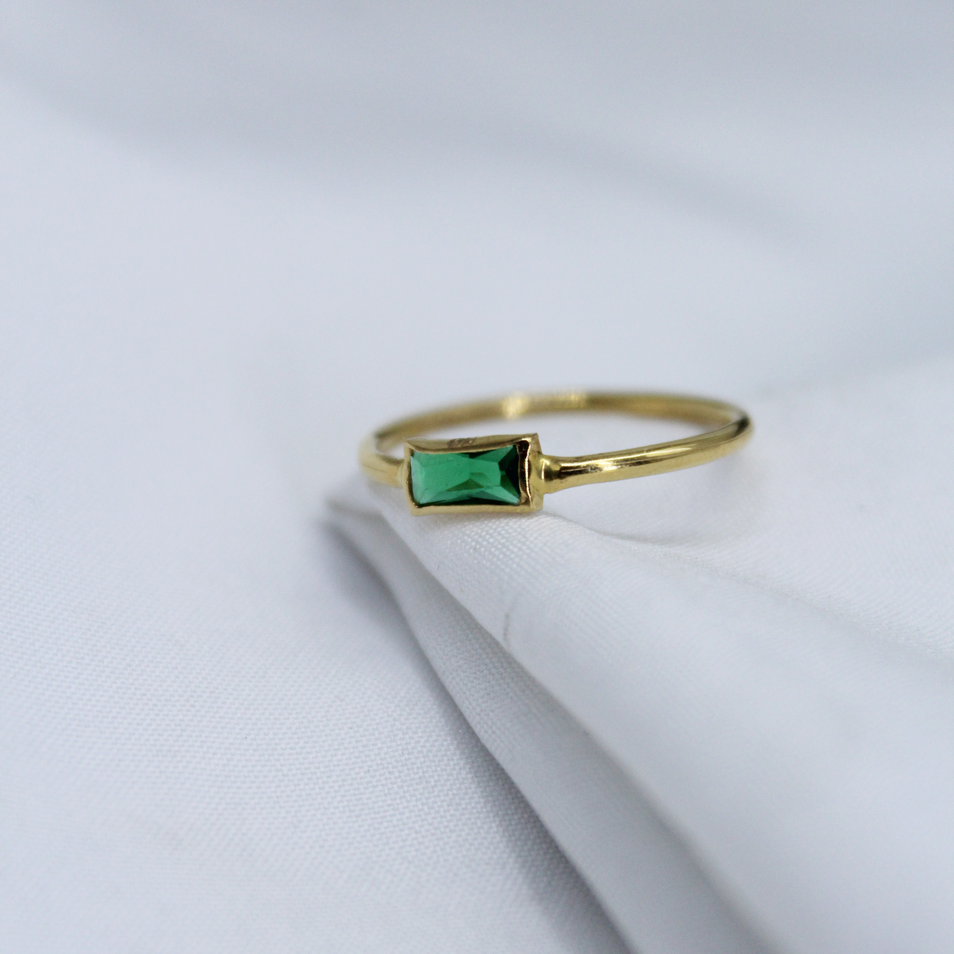 This ring features a sleek and minimal design highlighted by a rectangular green gemstone, adding a subtle touch of color and elegance. The clean setting enhances the stone while maintaining a modern and refined look.